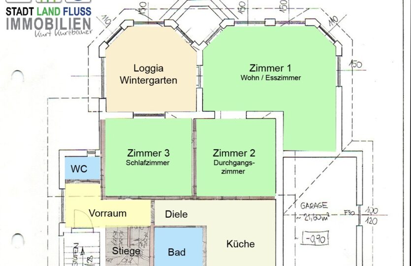 Vorraum, Diele, Badezimmer, separates WC, Schlafzimmer, weiteres Zimmer (Durchgangszimmer), Küche inklusive aller E-Geräte, sowie ein helles Wohn- und Esszimmer mit Zugang zur Loggia / Wintergarten.